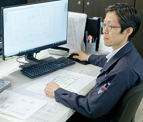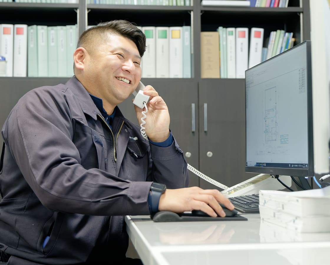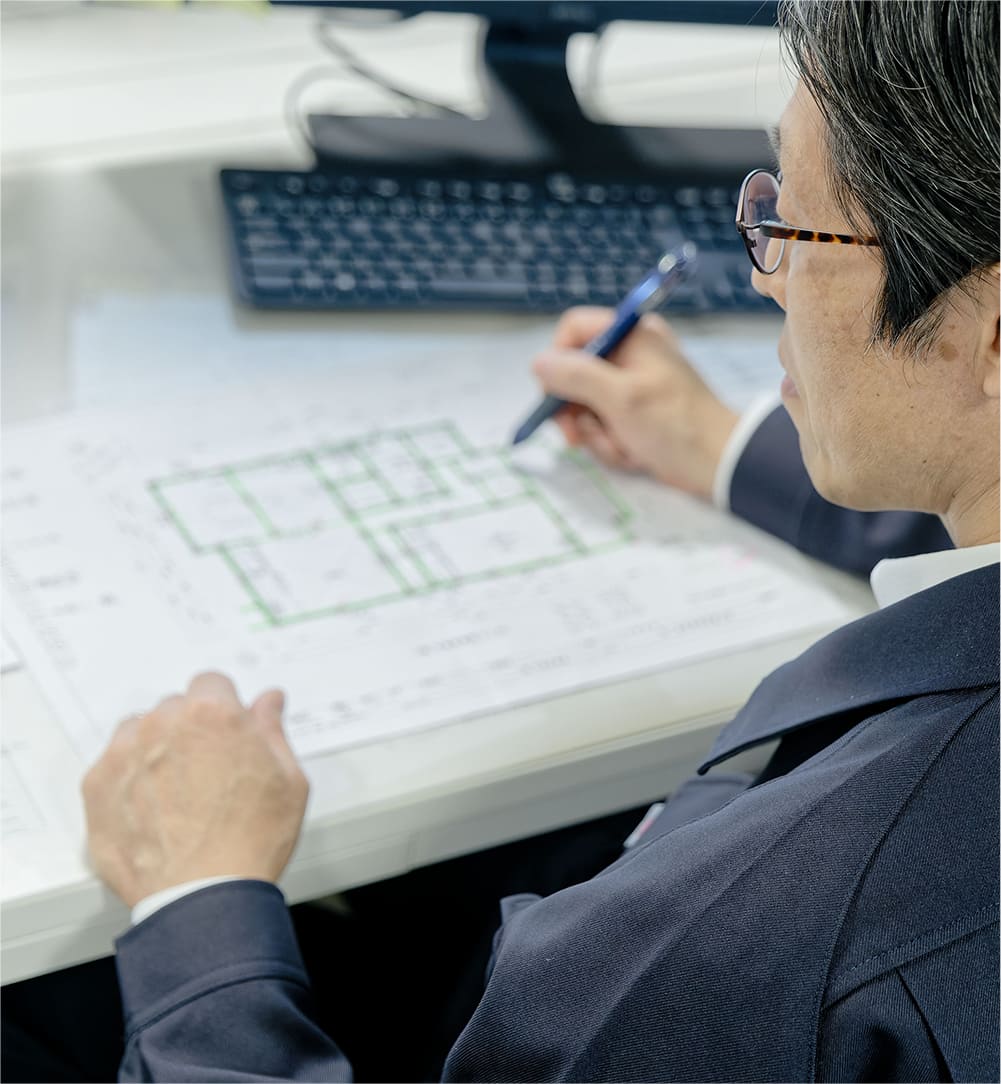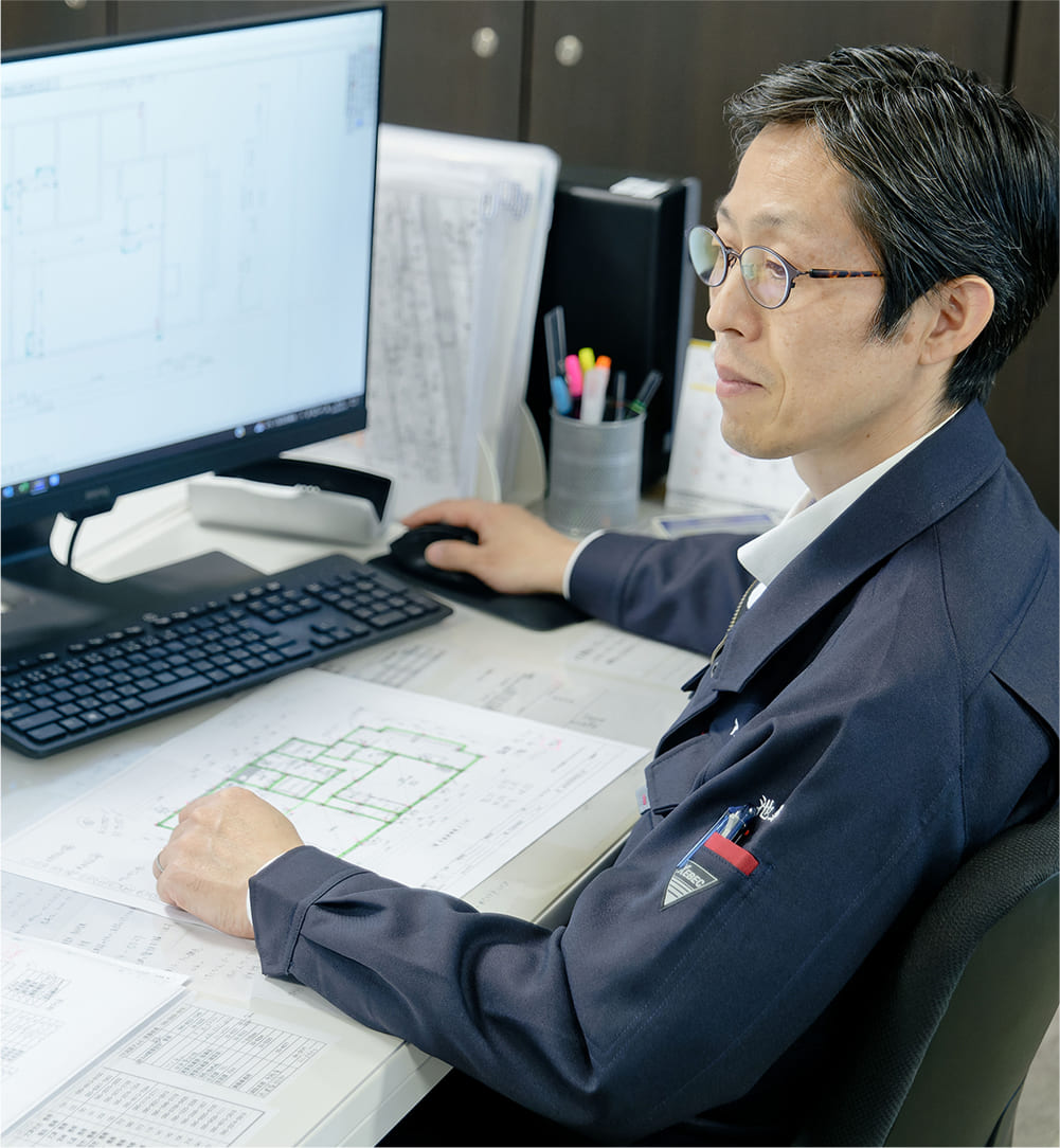 設計部の主な仕事は、建築プランの設計、各種公的機関への申請依頼業務です。お客様からの要望や予算などの条件を踏まえながら、建築物の外観や内装、構造、機能性などを考慮して、設計図面を作成します。建築物の全体像をイメージしながら実際の施工現場と連携し、スムーズに施工が進むようにサポートも行います。
